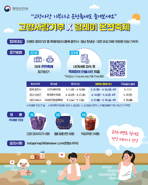 올봄, 충주·창녕·유성의 따뜻한 온천에서 몸도 마음도 힐링해보세요. 지역을 살리고 나도 즐거운 고향사랑기부X온천축제 릴레이 이벤트에 지금 바로 참여해보세요!